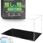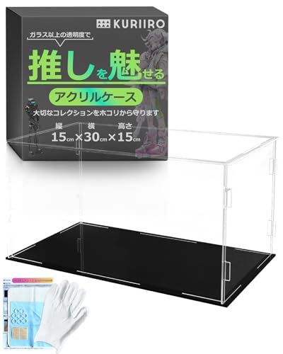 kuriiroのアクリルフィギュアケースは、幅30cm×奥行15cm×高さ15cmの組み立て式ディスプレイケースです。フィギュアやプラモデルのコレクションを美しく展示できます。