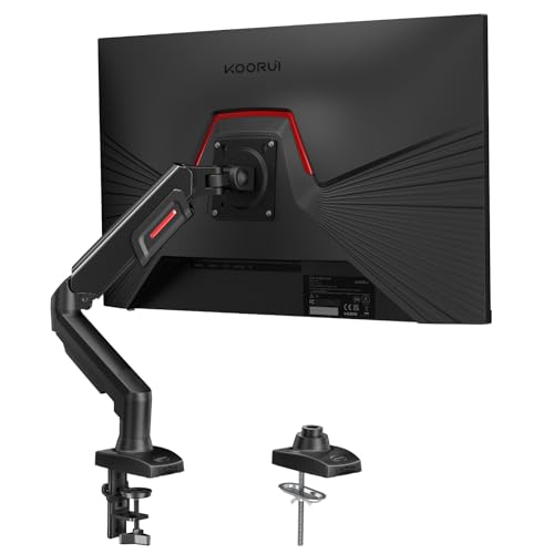KOORUIモニターアームは1画面用で、17~32型モニターに対応。耐荷重9kgを誇り、クランプ式&グロメット式で取り付け可能。多角度調節とケーブル管理機能も備え、作業環境を整えます。