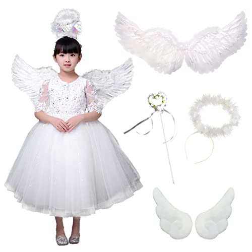 天使の羽コスプレセット。子供向けの白いエンジェル羽、輪、ハートステッキ、髪飾りの4点セット。男女共用で、特別な仮装やコスチュームに最適。サイズは80*40cm。