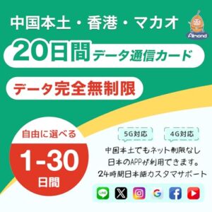 【Almond SIM】中国本土 simcard 20日間 高速データ通信 完全無制限 香港 マカオにも利用可能 1-30日間選択可能 中国ネット規制対象外 中国でもGoogle、LINE、YouTubeなど利用可能 24時間安心サポート 5G 4G-LTE対応 プリペイド SIMカード China simカード (20日間/無制限)