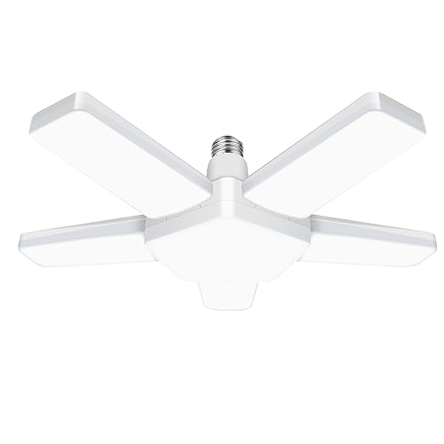 4個入りのLEDガレージライトは、角度調節可能な5灯式で、省エネ設計。駐車場や倉庫、ジムなどに最適な作業灯で、折りたたみ・変形も可能。