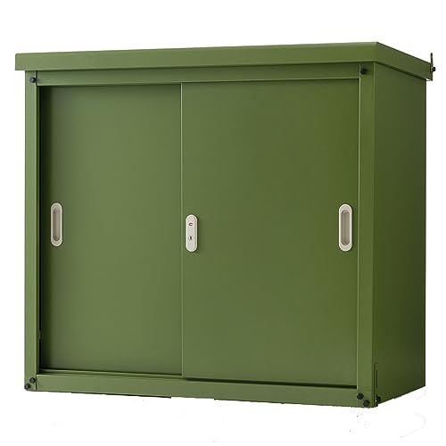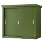 アイリスプラザのスチール収納庫Sは、容量945Lで可動棚付き。高耐荷重、防サビ塗装、専用カギ付き、水抜き穴、転倒防止補助具が備わるカーキ色の収納庫です。