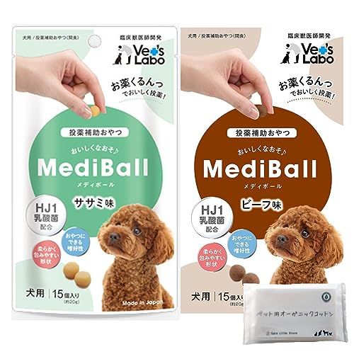 メディボール犬薬飲ませるおやつは、ささみとビーフの2種セットで各15個入り。投薬補助に便利で、愛犬の飲みやすさを考えた商品。SLS限定のオーガニックコットンも付いています。