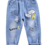 [EnDast] イラスト ペイント LUCKY ダメージ デニム パンツ ジーンズ 薄色 七分丈 長ズボン 女の子 ガールズ 韓国子供服 90cm 100cm 110cm 120cm 130cm 140cm (90)