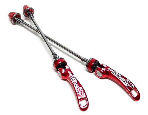 クイックレリーズ MTB・ロードバイク用フロント・リアセット(レッド)。軽量アルミ製で耐久性があり、簡単に取り付け・取り外し可能。高い剛性と安全性を兼ね備え、快適なサイクリングをサポートします。