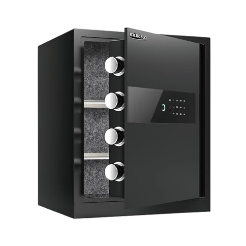 指紋認証とテンキー式の電子金庫。タッチパネル操作で簡単管理。アラーム機能付きでセキュリティも万全。家庭用に最適、固定可能なデザイン。サイズ: 45cm、カラー: 黒。