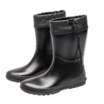 レインブーツ レディース 半長靴。防水素材で柔らかく、ミドル丈で快適さを提供。梅雨や台風、農作業・園芸・釣りに最適。カラーは黒で、サイズは24.5-25cm。