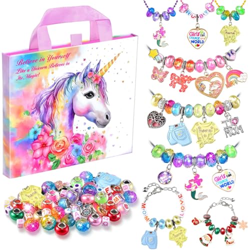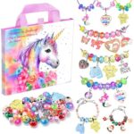 ガールズチャームブレスレットメイキングキットは、ユニコーンデザインのジュエリーを自分で作れるDIYアート克セットです。6歳から12歳の女の子に最適なクリエイティブな誕生日プレゼント。