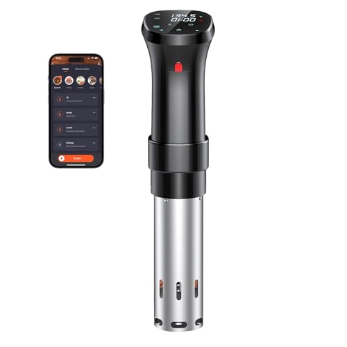 1100Wハイパワーの低温調理器。APPで遠隔操作可能、真空調理対応。IPX7防水、タッチパネル、クリップ式で使いやすく、タイマーと温度設定も完備。五重の安心保護機能付きで安心して使用できます。