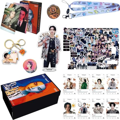 SUGA 福袋 2023年限定のシュガグッズセット。ヘアバンド、透明シール、フォトカード、アクリルスタンド/キーホルダー、落下防止ストラップ、テープなど多種類の人気韓流応援グッズを含む贈り物に最適な福袋です。