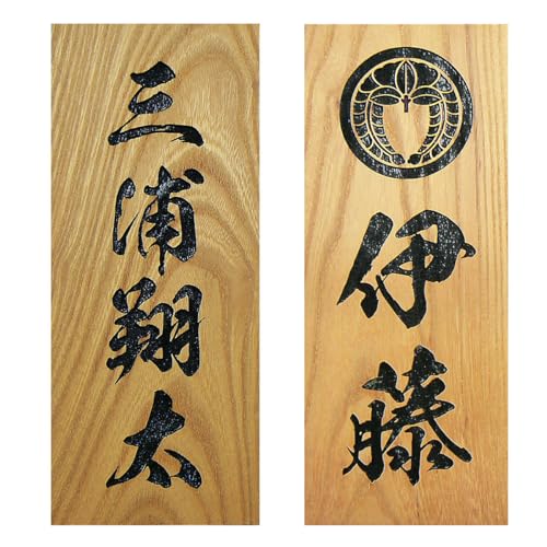 けやき製の達筆表札は、家紋を彫り込んだ大きめサイズです。高級感あふれる木の質感と個性的なデザインで、玄関を華やかに彩ります。耐久性にも優れ、長くご使用いただけます。