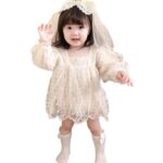 SLINXのベビー服は、女の子用のロンパースワンピース。長袖でレースと刺繍が施され、新生児に最適。北欧風の花柄デザインで、おしゃれでかわいく、お出かけにもぴったり。サイズ66、色はベージュです。