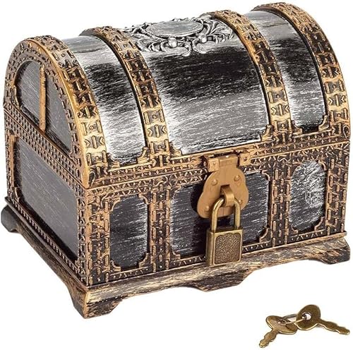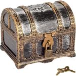 アンティーク調の合金製宝箱で、海賊テーマの収納ボックスです。小物やアクセサリーを収納できるヴィンテージインテリア雑貨として最適で、インテリアのアクセントにもなります。