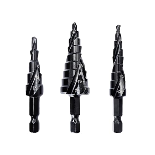 この3本セットのステップドリルは、チタンコーティングで耐久性が高く、ステンレス用に適しています。サイズは4-20mm(9段)、4-12mm(9段)、4-12mm(5段)で、鋭い切れ味を提供します。収納袋付きで便利です。
