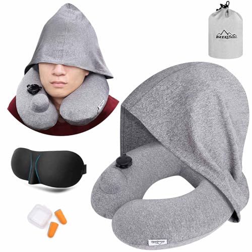 BREENHILL ネックピローはフード付きで、清涼感のあるインフレータブルデザイン。オフィスや旅行に最適で、持ち運びも簡単。灰色の綿質の冷たい布を使用し、快適なヘッドサポートを提供します。