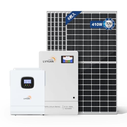 LVYUANの51.2V 100AH LiFePO4バッテリーと5000Wハイブリッドインバーター、2460Wソーラーシステムがセット。エネルギー蓄電量5.12kWh、発電量7.87kWh。日本語施工方法付。