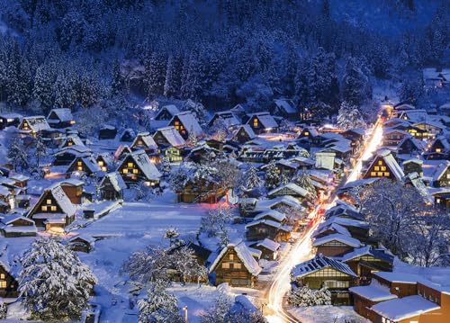 やのまんの500ピースジグソーパズル「灯りともる白川郷」は、岐阜の美しい風景を描いた作品です。サイズは38x53cmで、ピース請求ハガキ、のり、へら、サービスカード、トリセツが付属しています。
