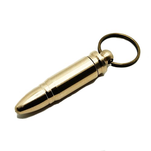 真鍮製のバレットキーホルダーは、カッターナイフ機能を備えたミリタリースタイルのアクセサリーです。弾丸デザインの薬莢が特徴で、ゴールドカラーが魅力的。文房具やパーツとしても利用可能。
