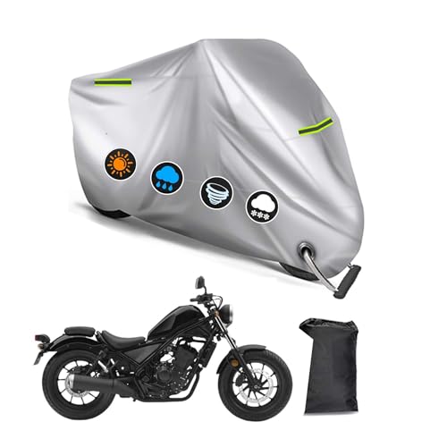 ホンダレブル250 ABS専用のバイクカバー。3つの反射ストリップ、UVカット、凍結防止機能を備え、盗難防止のロック穴とワンタッチバックル付き。オールシーズン対応で収納バッグ付きです。