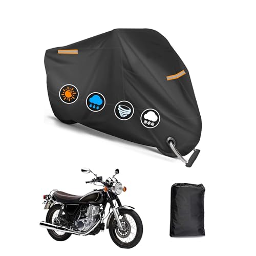 Misoso 【2024年新アップグレード】 バイクカバー 厚手 300D 防水・耐熱 バイクカバー大型 7つの幅広い警告反射ストリップ付き 盗難防止ロック孔 前後のワンタッチ防風クリンチ、雨、雪、紫外線、風、ほこりからバイクを保護する防雨カバー 収納袋付き (XXXL:265*105*125cm)