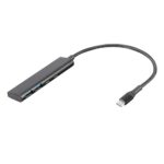 Digio2 USB3.2 Gen1 Type-C 4ポートハブ。Cx2/Ax2の接続で、データ転送速度は最大5Gbps。コンパクトなアルミニウムデザインで、ブラックカラーが特徴。
