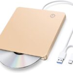 外付けCD/DVDドライブはUSB 3.0&Type-C対応、スロットイン式でタッチイジェクト機能。Mac/Windows/Linuxに対応し、DVD/CD/VCDの読み書きが可能。薄型デザインでポータブルなゴールドカラーのドライブです。