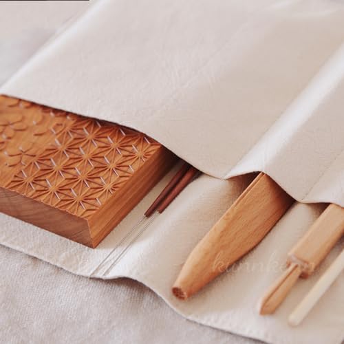 KENNKUNNの和菓子道具セットは、練りきり用の木彫千筋板4種、針切り箸、菊形の三角棒、筋付押し棒が含まれています。手作り和菓子に最適な木製器具です。