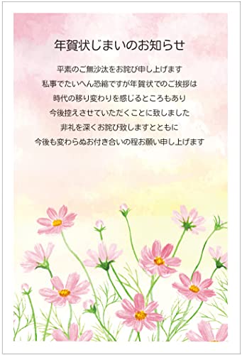 年賀状じまいハガキ 10枚セット。切手付きの官製はがきで、アルファプリントサービスの公式製品。デザインはNJ206コスモス。手軽に年賀状の後処理ができます。