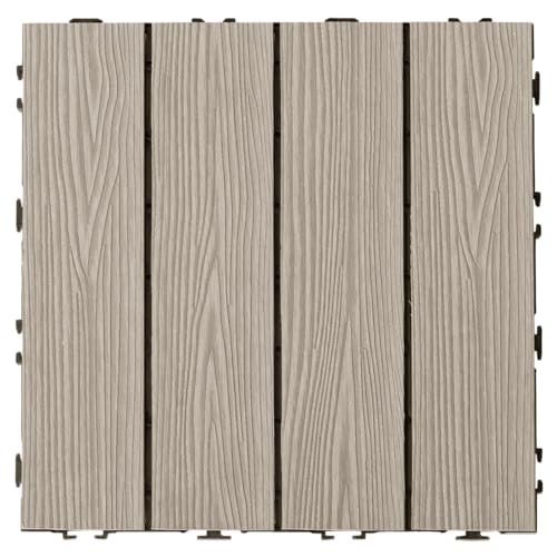 タンスのゲン ウッドパネルは、人工木製のジョイント式ベランダタイルです。27枚セットで、サイズは30×30cm、ストライプデザインのアッシュグレー。2.4平米のスペースに最適です。