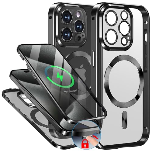 WMT iPhone 15 Proケースはマグセーフ対応で、金属ボタンロックや360°保護を備えた軽量合金バンパー。9H強化ガラス使用で傷防止、ワイヤレス充電も可能。