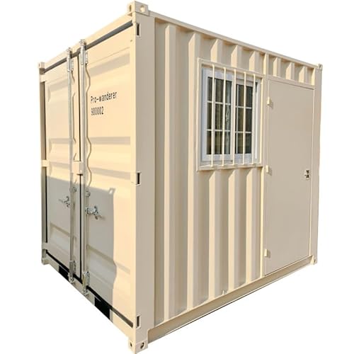 大型スチールコンテナハウス(約3.4畳)屋外物置。鍵付き・ドア・窓付き。工具収納庫や保管庫に最適。耐久性抜群で組立不要、簡単設置。店舗用や車庫、資材置き場におすすめ。
