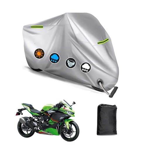 カワサキNinja ZX-25R/SE/SEKRT/400専用のバイクカバー。UVカット、凍結防止機能、盗難防止のロック穴付き。収納バッグ付きで、オールシーズン対応。反射ストリップ付き。