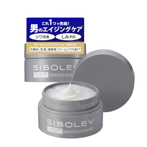 SIBOLEYのエイジングケア メンズ オールインワン ジェルクリームは、医薬部外品で、シワ改善、美白、保湿を実現。無香料、ナイアシンアミド配合で、化粧水、美容液、乳液の機能を持つ100gの日本製スキンケア商品です。