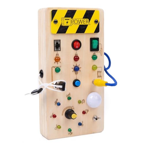 モンテッソーリのビジーボードは、1~4歳の幼児向け。木製で安全、指先の発達を促進。入園祝い、誕生日プレゼントに最適で、LEDイルミネーション付き。
