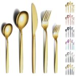 Evandaディナーカトラリーセットは、ゴールドの5種20点セットです。ナイフ、フォーク、スプーン、ティーフォーク、ティースプーンが含まれ、18-0ステンレス鋼のチタンメッキ仕上げ。食洗器対応で、おしゃれなデザインの食器セットで、キャンプやデザートにも最適です。4人分に対応しています。