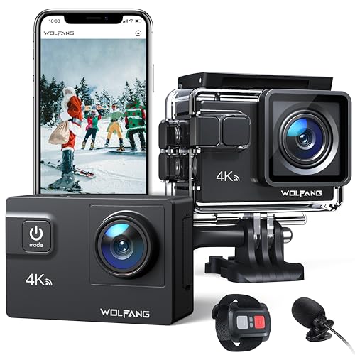 WOLFANG GA300は、4K解像度と24MPの画像を提供するアクションカメラです。外部マイク、WiFi機能、170°広角レンズ、170度の防水性能(40m)、2つの1350mAhバッテリー、HDMI出力付きで、豊富なアクセサリーも揃っています。