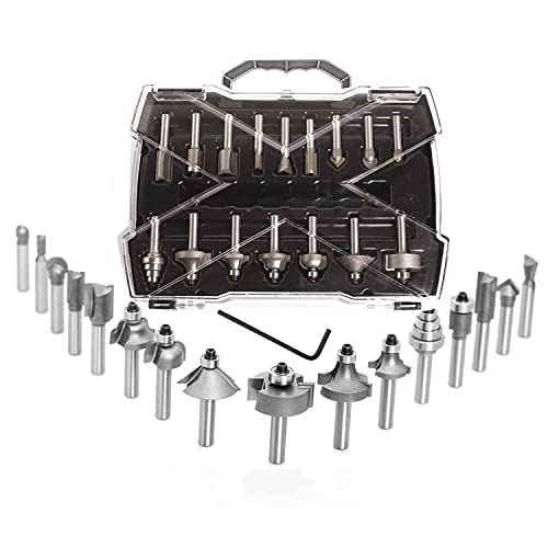 トリマービット6mm軸径のセット。超硬タングステン鋼製、15本のビットと4つのベアリング付き。溝ほり・面取り・飾り面加工に対応。耐磨耗・耐腐蝕・耐久性が高く、キックバックを軽減する設計です。