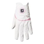 フットジョイのウェザーソフは、ホワイト/ピンクのデザインで、左手用(右利き用)のレディースグローブです。サイズは19cm。耐久性と快適性を兼ね備え、優れたグリップ力を提供します。