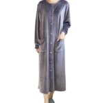 ネグリジェ パジャマ レディース 冬用。長袖ワンピースで前開き、ふわふわのストレッチベロア素材。伸縮性に優れ、ロング丈で暖かくリラックスできるルームウェアです。カラーはネイビー、サイズはLL(77515)。