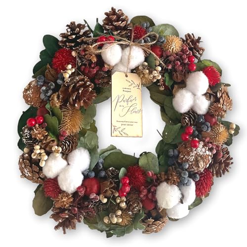 フローリストレマンのクリスマスリースは、玄関ドア用の直径30cmサイズで、北欧風のナチュラルなデザイン。大きくて御洒落なドライフラワーの飾りで、クリスマスの雰囲気を演出します。