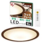 アイリスオーヤマのLEDシーリングライトは、6畳用で調光10段階、調色11段階が可能。節電モードやリモコン付き、3300lmの明るさを持ち、ウッドフレームデザイン。