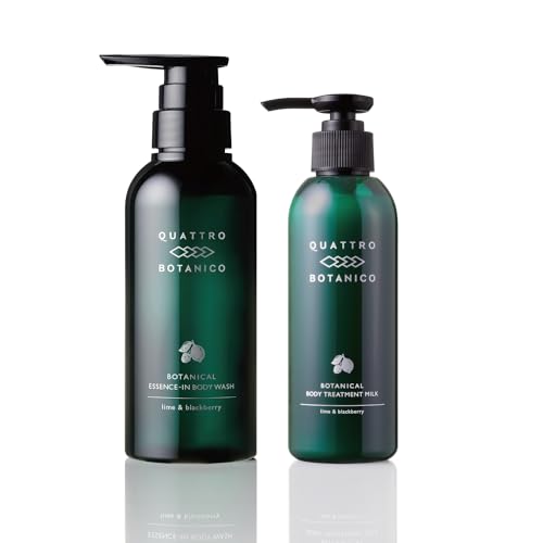 クワトロボタニコのボタニカルボディウォッシュ(300ml)とボディミルク(180ml)のセット。ライム&ブラックベリーの香りで、乾燥肌や敏感肌に最適。全身用の保湿クリームとして、しっとりと肌を守ります。