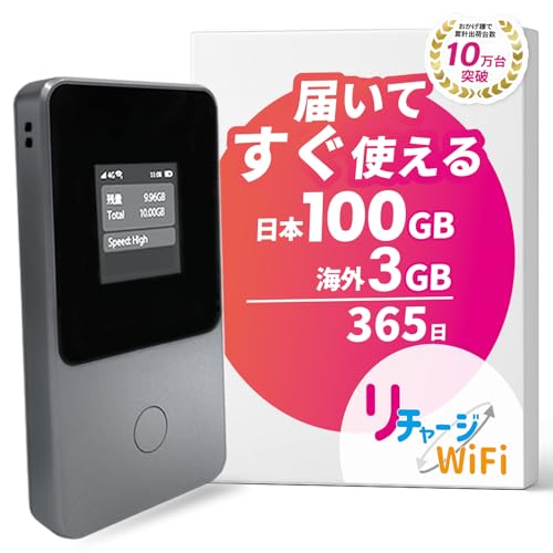 リチャージWiFiのポケットWiFiは最大1年間利用可能。小型でロングバッテリー、契約返却不要。月額費用無しで、国内外で簡単に使えます。電源ONで即時接続可能!