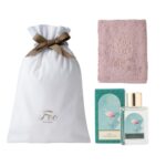 Foo Tokyoのオーガニックコットンハンドタオル(ピンク)とバスオイルDreaming Aromaのギフトセット。高級感あふれる巾着付きで、乾燥肌に最適な植物オイルを使用したボディケアアイテム。女性へのプレゼントにおすすめ。