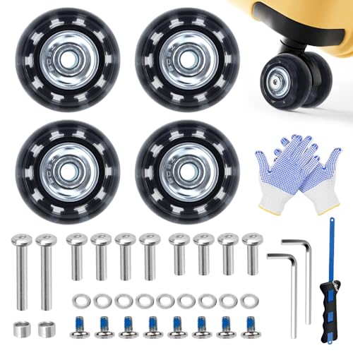スーツケースタイヤ交換キットは、静音設計の4個セットです。キャリーバッグやスーツケースの車輪補修に最適。DIYで簡単に交換可能で、ノコギリ付き。サイズは40mm×18mmの透明タイプです。