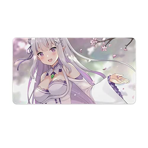 大型エミリアデザインのリゼロデスクマット。耐久性と滑り止め機能でPC操作が快適。エッジ縫製加工でお手入れ簡単。サイズ40x75cm、仕事や学習にも最適。おしゃれな萌えキャラでプレゼントにも最適。