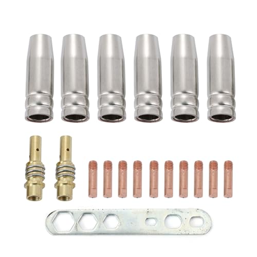 半自動溶接機用の汎用アクセサリー19点セット。ノズル、チップ、ボディ、レンチ、ホルダ、トーチ、コンタクトなど消耗品を含み、補修やリプレイスに最適なパーツです。