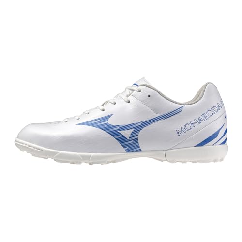 [ミズノ] フットサルシューズ モナルシーダ NEO SALA CLUB TFは、部活動やフットボールに最適な軽量インドアシューズです。サイズ27.5 cm、幅広3E、ホワイト×レーザーブルーのデザイン。