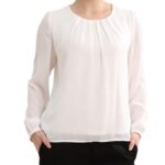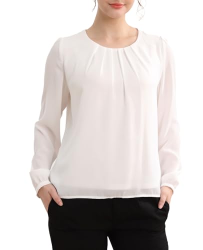 春秋に最適な長袖シフォンブラウス。タックデザインでキレイめな印象を与え、裏地付きで安心感。通勤やオフィスシーンにぴったり。洗え、着痩せ効果もあり。ホワイトのLサイズ。