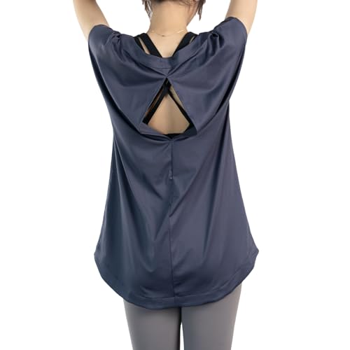 ヨガウェア レディースで美背中デザイン。背中開きのゆったりトップスは体型カバーに最適。ロング丈、半袖で冷感素材、吸汗速乾性、UVカット効果あり。ナチュラルなネービーブルー色でおしゃれなフィットネスやルームウェアにぴったり。
